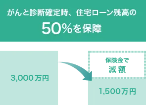 - 『がん50%保障特約付団信』は、通常の団体信用生命保険(死亡・所定の高度障害状態)の保障に、がん(所定の悪性新生物)と診断確定された場合、余命6ヶ月以内と判断された場合の保障を加えた団体信用生命保険です。加入時年齢が満50歳未満のお客さまがご利用いただけます。