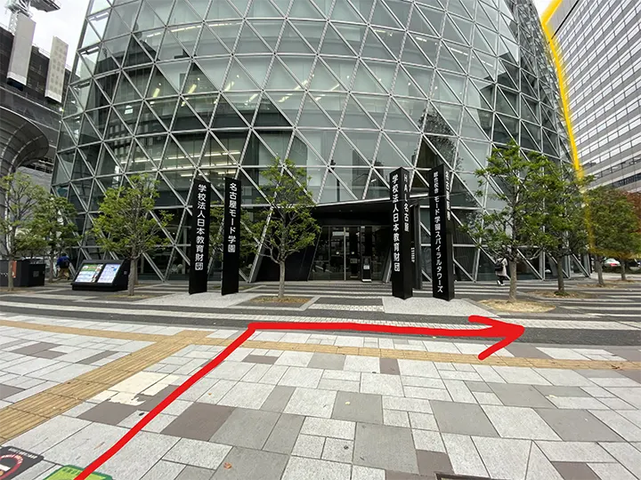 《店舗アクセス②》「笹島交差点」を「モード学園スパイラルタワーズ」方向へお進みください。 ※中央の黄色の枠で囲まれたビルになります。
