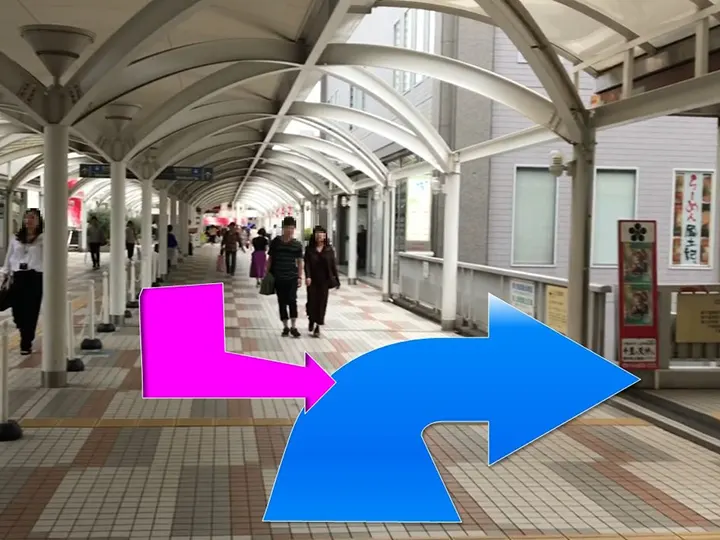 ≪店舗アクセスのご案内≫ピンク矢印:北大阪急行電鉄南北線南出口より地上2階あがってまっすぐ来たところ/青矢印:モノレール改札を出て右手